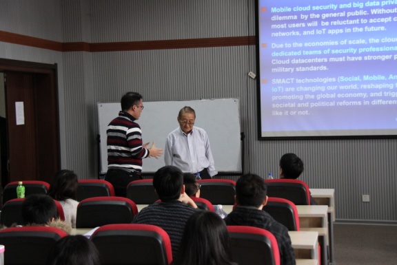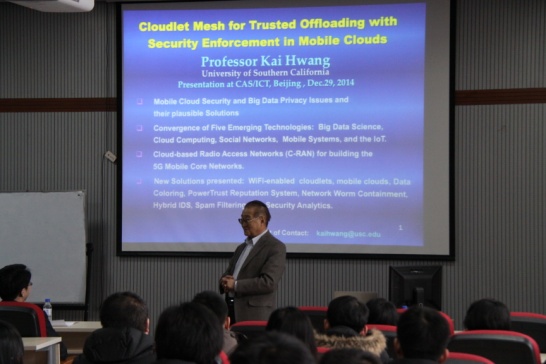 2015年1月13日上午,应我校pp电子游戏官网院长魏晓辉教授的邀请,美国南加州大学电气工程与计算机科学系黄铠教授来校进行学术访问与交流,并做题为“移动云计算中的信任转移安全基础设施”的报告。