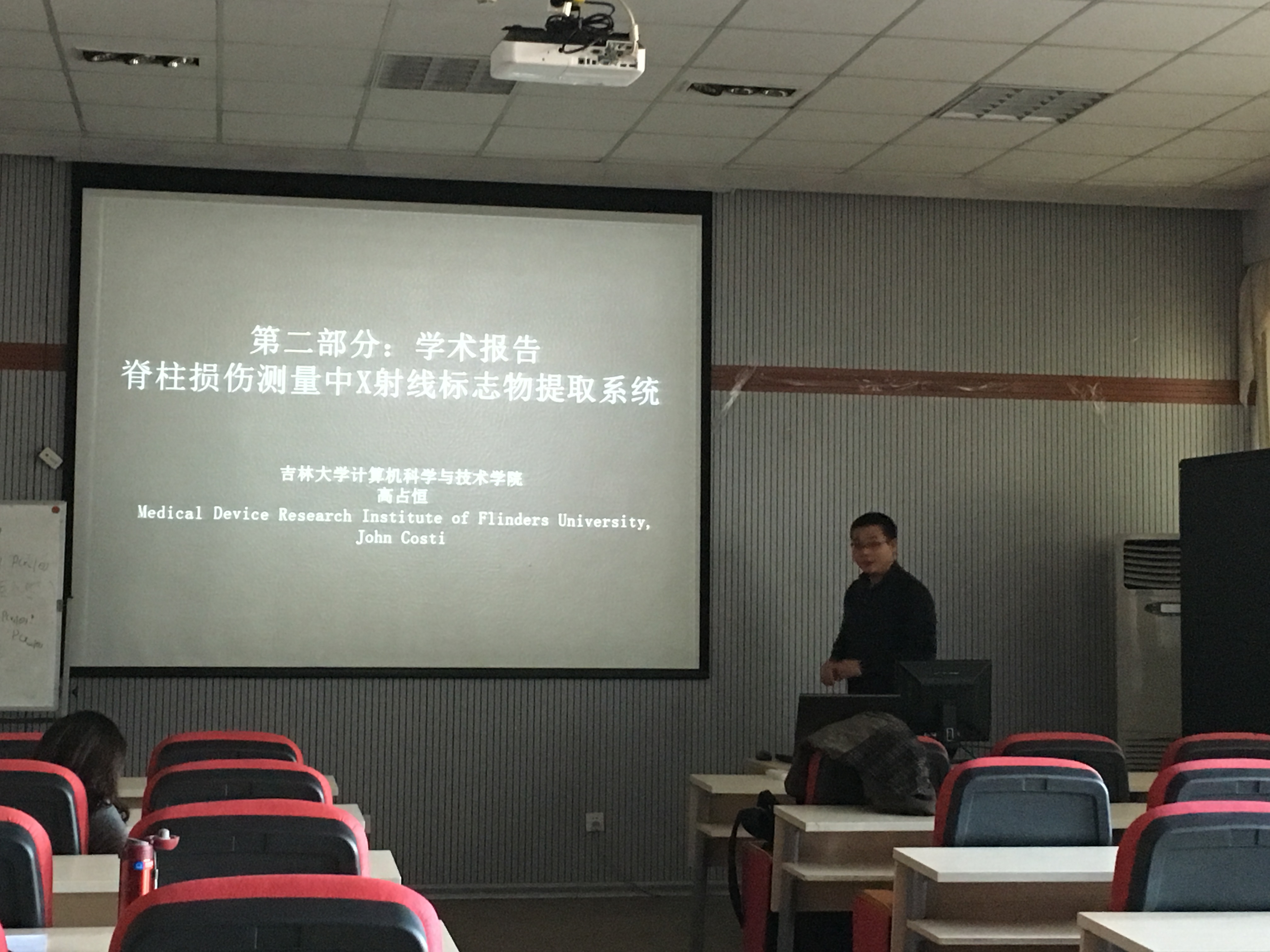 2016年11月24日上午,pp电子游戏官网计算机学院高占恒副教授在计算机学院做了题目为“脊柱损伤测量中X射线标志物提取系统”的学术报告。报告主要介绍了高占恒副教授在澳大利亚从事访问学者期间,取得的一系列关于脊柱损伤测量中X射线标志物数字化的研究结果。报告中,高占恒副教授首先介绍了澳大利亚的工作、生活情况,然后介绍了脊柱损伤问题的定义、目前解决方案、本人在访学期间做的工作,着重介绍了其在访学期间研发的一款半自动X射线标志物数字化软件WireDig,包括软件的功能、特点,以及与原有软件相比的优势。