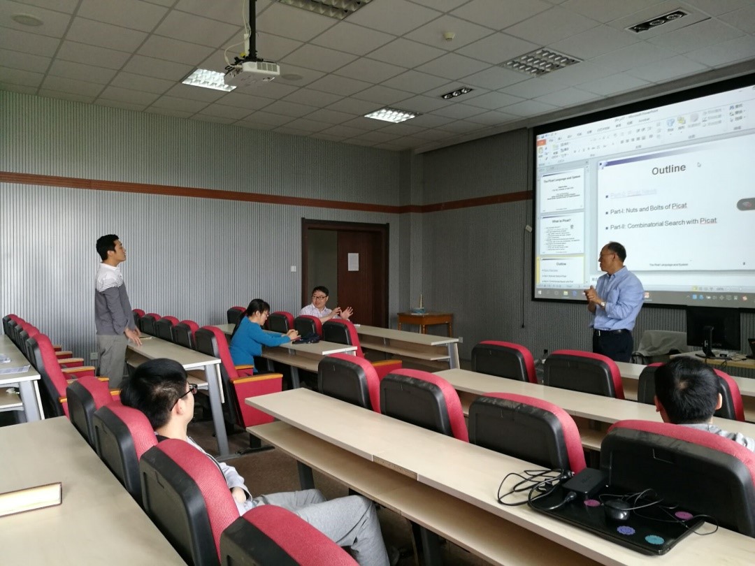 报告最后,Neng-Fa Zhou教授与现场师生进行了探讨交流,就Picat、约束、SAT等问题进行了充分的讨论,为现场师生进行相关方向的研究提供了较好和较新的思路。在互动中,学生加深了对Picat的了解和认识。最后整个讲座在热烈的掌声当中结束,参加此次报告的同学们均表示收获颇丰。