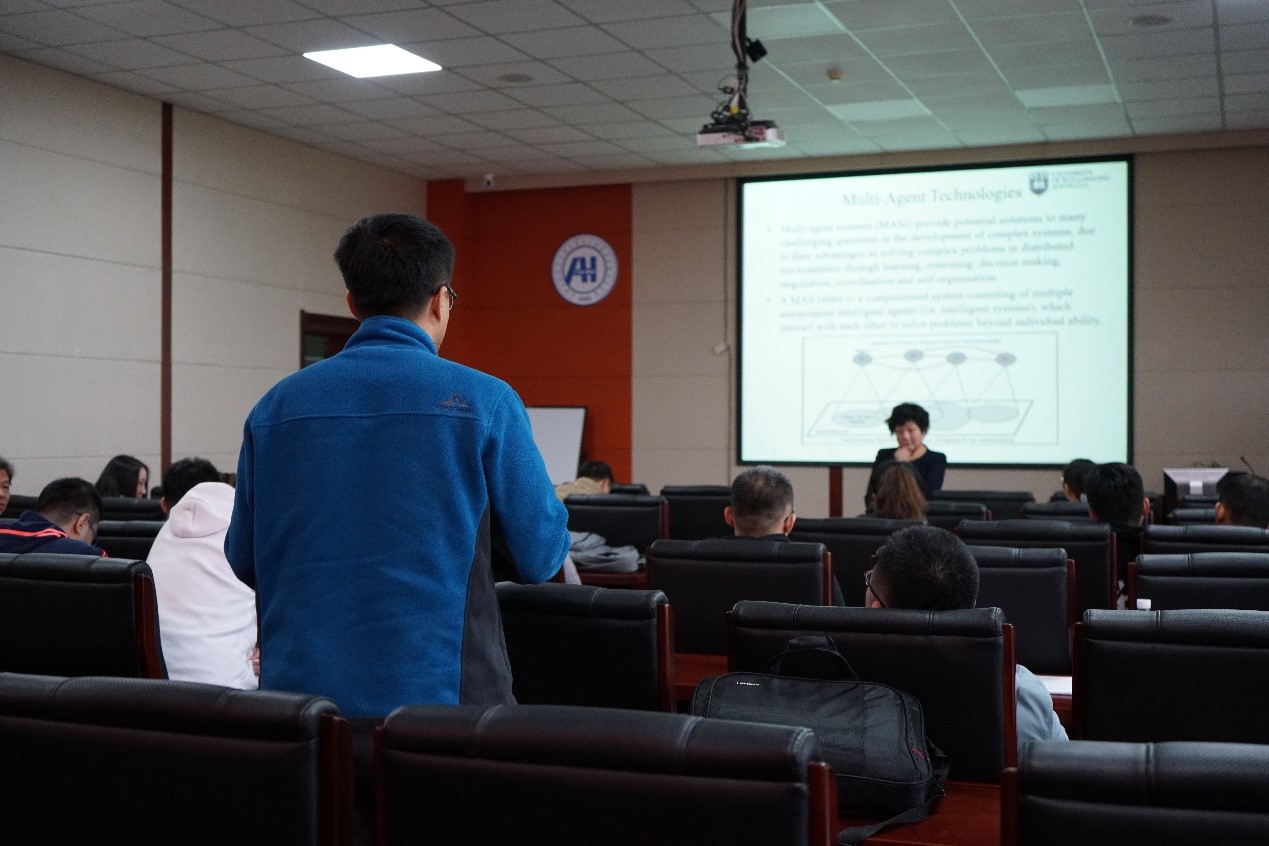 在报告中,Minjie Zhang教授首先介绍了目前复杂系统开发过程中的挑战性问题。一个复杂的系统组件之间存在着大量的交互,关系复杂。组件之间的聚合活动往往是非线性以及自组织的。由于各实体之间的自主决策、复杂关系、资源的分布方式以及环境的动态性,使得传统的计算方法难以对复杂系统进行仿真或建模。针对这些挑战,Zhang教授介绍了自己团队研究的项目,提出多智能体系解决方案,主要包括智能电网系统中的多智能体解决方案和应急管理中的多智能体解决方案。在提问环节,到场师生踊跃提出问题,Zhang教授一一耐心解答,并介绍了攻读博士的经验和方法。报告受到师生的一致好评。