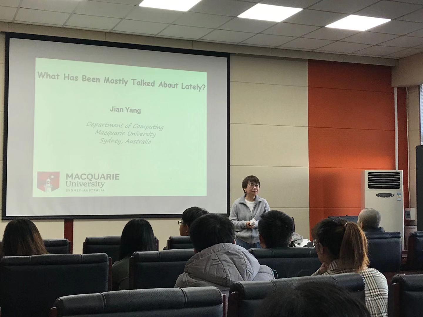 2019年11月15日上午,澳大利亚麦考瑞大学的杨坚教授应pp电子游戏官网邀请,在计算机楼A521作了题为“Twitter中的主题派生”的学术报告。