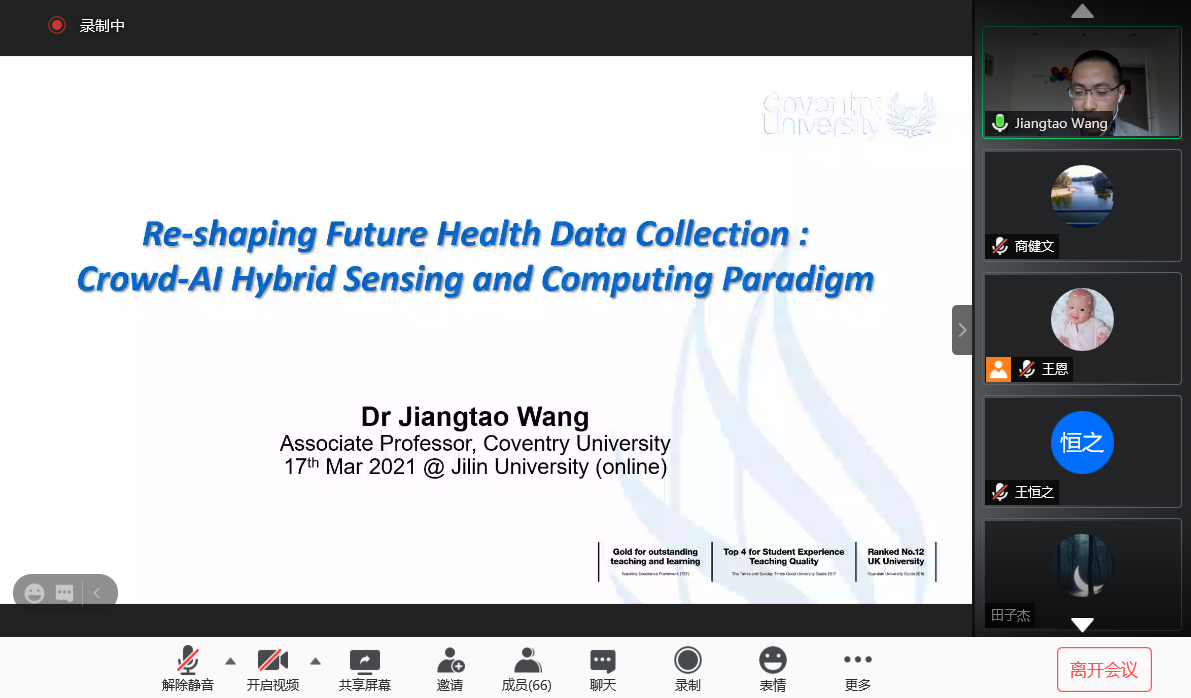 2021年3月17日下午,英国考文垂大学王江涛副教授应pp电子游戏官网邀请,以线上形式作了题为“重塑未来人群健康数据的收集:Crowd-AI混合感知和计算范例”的学术讲座。