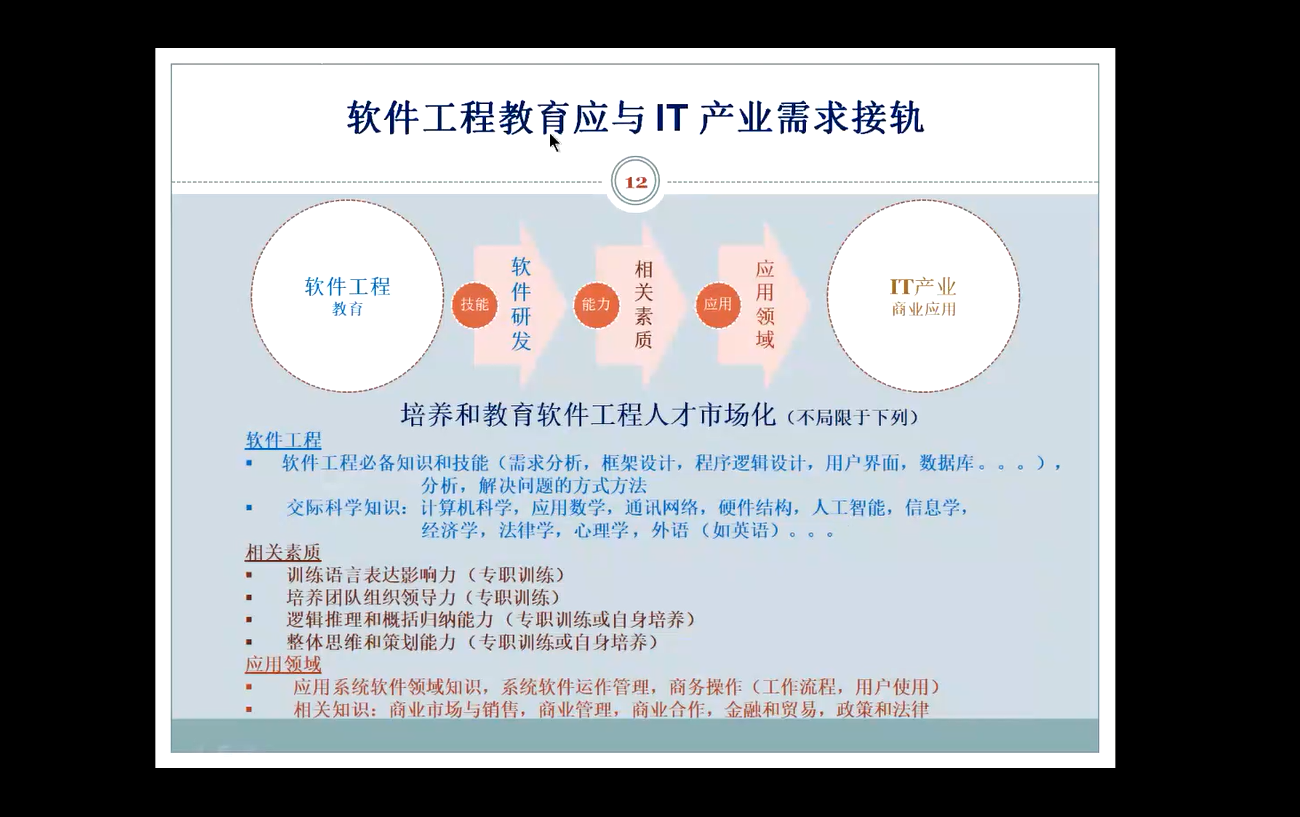 在本次讲座中,吴晓东老师首先简要介绍了IT产业和软件工程的关系。然后提出在软件的理论、研发和使用过程中存在着矛盾和平衡关系。接下来讨论了软件工程与IT产业的接轨方式,着重介绍了软件开发过程中应重视商业规划和商业目标。最后提出软件工程教育应与IT产业需求接轨,除了本身对软件工程必备知识和技能的学习,也应注意人才的多方面培养,例如交际科学知识和相关素质。此外,吴晓东老师根据自己的工作经验还给出了软件人才岗位与对应的技能要求。