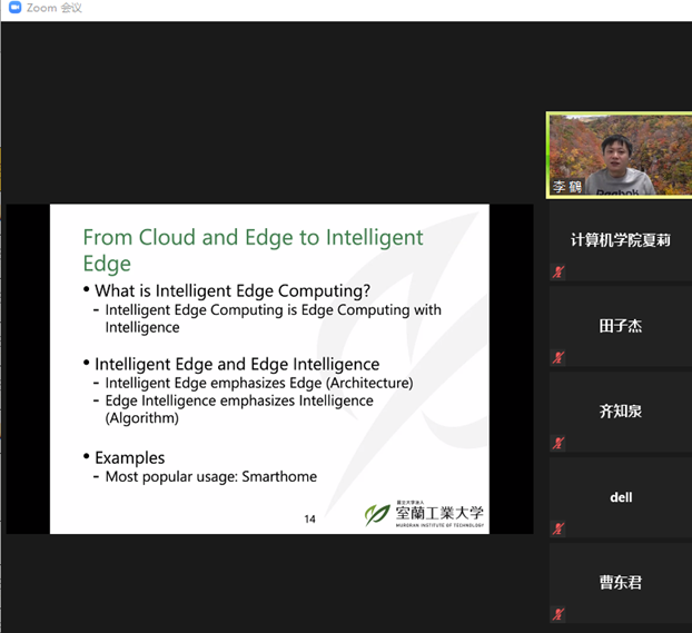 2021年12月14日下午,日本国立大学法人室兰工业大学助理教授,日本文部科学省卓越研究员李鹤老师应pp电子游戏官网邀请,在线上ZOOM会议平台作了题为“从云计算、边缘计算到智能边缘计算”的学术报告,报告由pp电子游戏官网副院长李强教授主持。