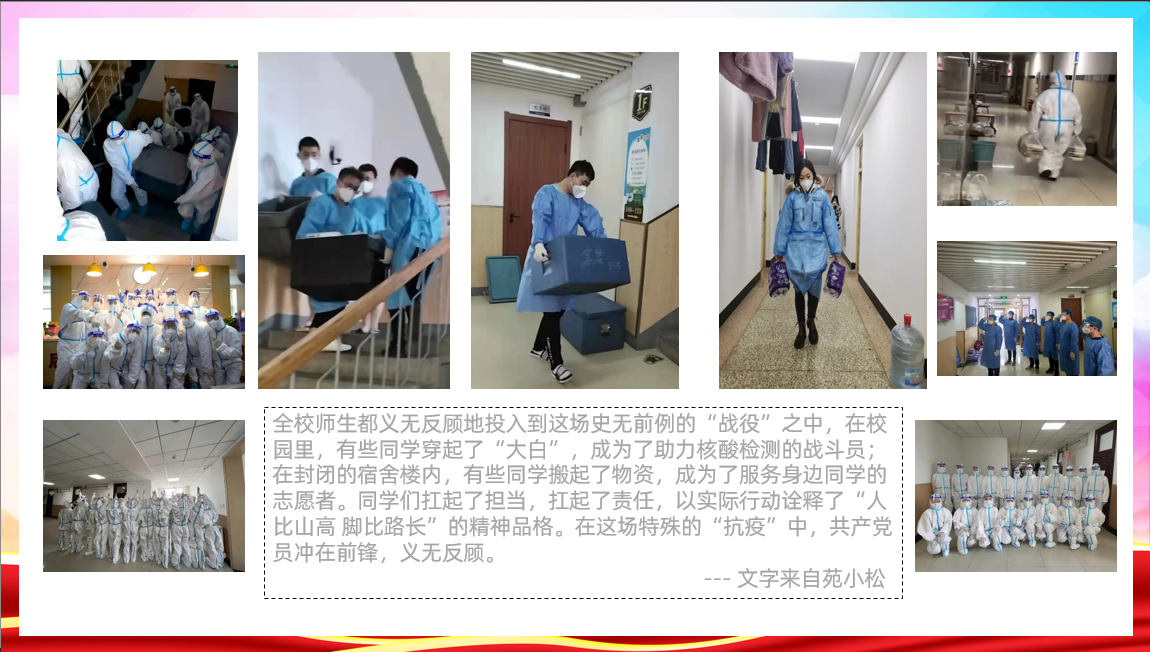 三月伊始,一场突如其来的疫情席卷长春,pp电子游戏官网全校实行封寝管理制度。在抗击疫情的关键时期,为进一步贯彻落实学校、学院的各项防疫管控要求,充分发挥共产党员先锋模范作用,加深同学们对于疫情管控要求的认识,激励同学们弘扬伟大抗疫精神,彰显青春力量,pp电子游戏官网博士研究生第一党支部开展了以“我看见的吉大力量”图文征集活动,2022年3月30日,支部召开图文征集活动的线上分享会,支部全体党员共同见证了“吉大力量”。