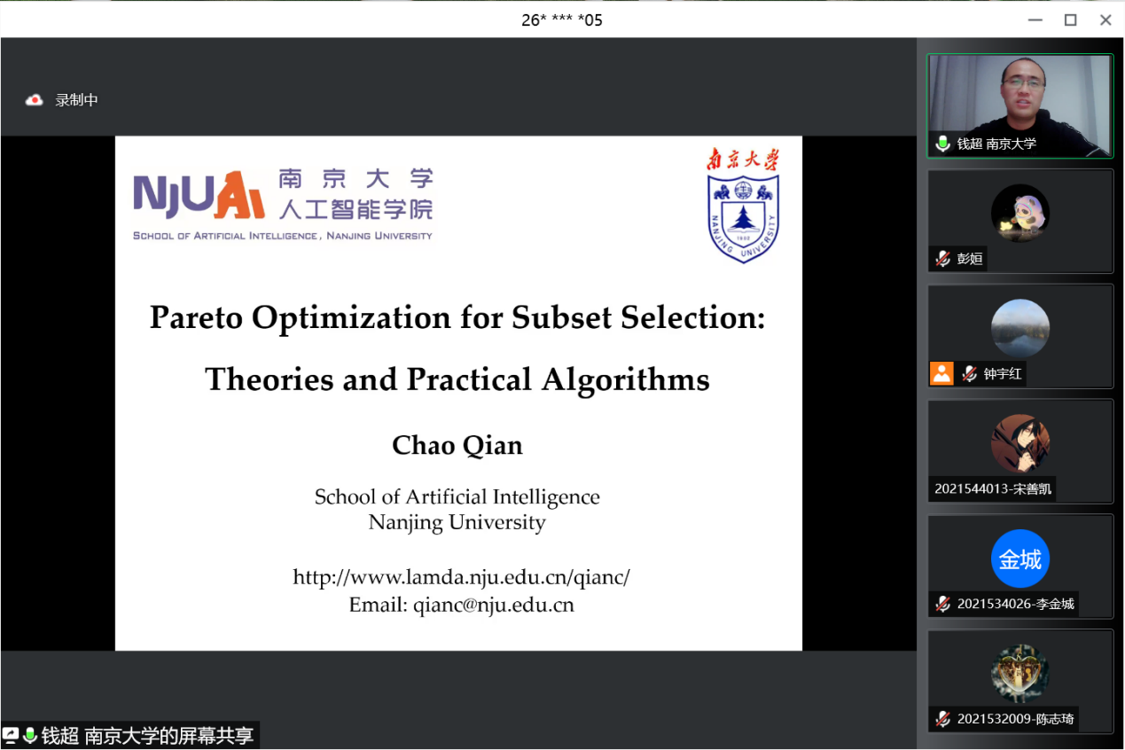 上半场,钱超老师以子集选择为题,讲述了子集选择的应用案例及多目标演化算法求解子集选择的问题。钱老师首先以传感器选择、自然语言处理中的文本摘要等为例,向同学们生动展示了什么是子集选择及其解决的问题。随后,钱老师介绍了子集问题的优化解决算法的进化过程——单目标优化、双目标优化、多目标优化。最后,针对子集选择的Pareto优化方法,老师分别深入介绍了具体案例改进的大规模子集选择、带噪子集选择、动态子集选择的Pareto优化算法。至此,会议上半程关于子集选择问题的学术分享圆满结束。