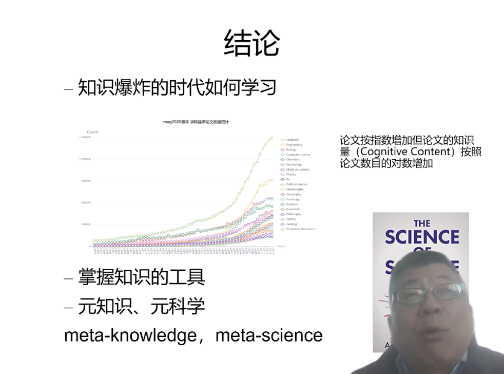 张教授此次报告报告分享的他最新的研究成果,主要从分4个方面进行讲解,分别是1)知识结构与知识本体;2)通识教育;3)两种文化与科学大战;4)知识能统一吗?(Consilience)。张教授从《大英百科》开始讲起,梳理了知识结构的历史,从柏拉图的《理想国》到亚里士多德的里的理论,再到培根的《新工具》,深入浅出地介绍知识结构的历史背景和现实意义。之后剖析了美国的通识教育对知识分类的具体做法,强调了数学和逻辑在知识的结构中的重要性。然后从索卡尔事件介绍了两种文化与科学大战的深刻主题,从而引出了知识能否统一的宏大问题。张教授对这个问题进行了深入地研究,从维基百科的知识分类到知识图谱,再到计算历史学,张教授通过丰富的史料、详尽的数据和鲜明的观点进行了详细的阐述。最后张教授以知识爆炸时代如何学习、如何掌握知识工具两个开放性的问题结束了这个报告,分享了他对元知识和元科学概念的独家见解。