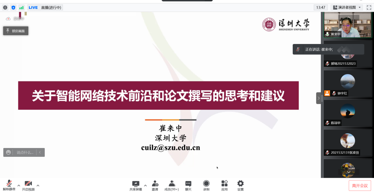 2022年4月20日晚六点半,pp电子游戏官网计算机学院研究生学术沙龙第十五期(线上特别版)暨《论文写作指导》课程第四讲顺利开讲,本期特别邀请到了深圳大学计算机与软件学院教授,博士生导师崔来中老师。崔教授以“关于智能网络技术前沿和论文撰写的思考及建议”为题目,为同学们带来论文写作指导课程的最后一讲,也意味着线上特别版研究生学术沙龙告一段落。