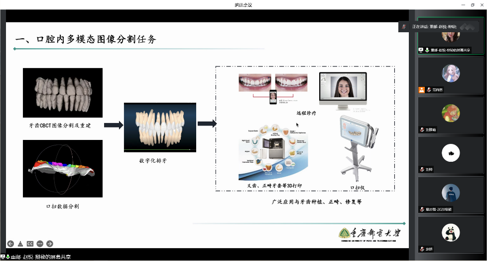 在讲座中,赵教授从口腔正畸到院流程入手,由浅入深为参加会议的同学讲解了曲面断层图像分割任务,口腔扫描图像分割任务,锥束CT图像牙齿分割任务,以及头影测量图像颈椎分割以及骨龄估计任务,并针对这些任务讲解了基于注意力机制的牙齿曲面断层图像分割的网络结构。报告首先分析了目前不同人牙齿性状,分布差异很大,并且患者常有缺牙,牙齿错位等情况带来的不便,由浅入深的介绍口腔数字化在人们生活中的应用与意义。并对发展趋势做了展望,此外,报告还介绍了赵悦老师所带领的课题组在此领域取得的部分成果。最后,在线师生踊跃提问,赵悦老师悉心的回答了线上师生的问题,本次报告受到了广大师生的热烈响应。多位老师对赵教授的研究内容表示出浓厚兴趣、并就开展科研合作的展开讨论。