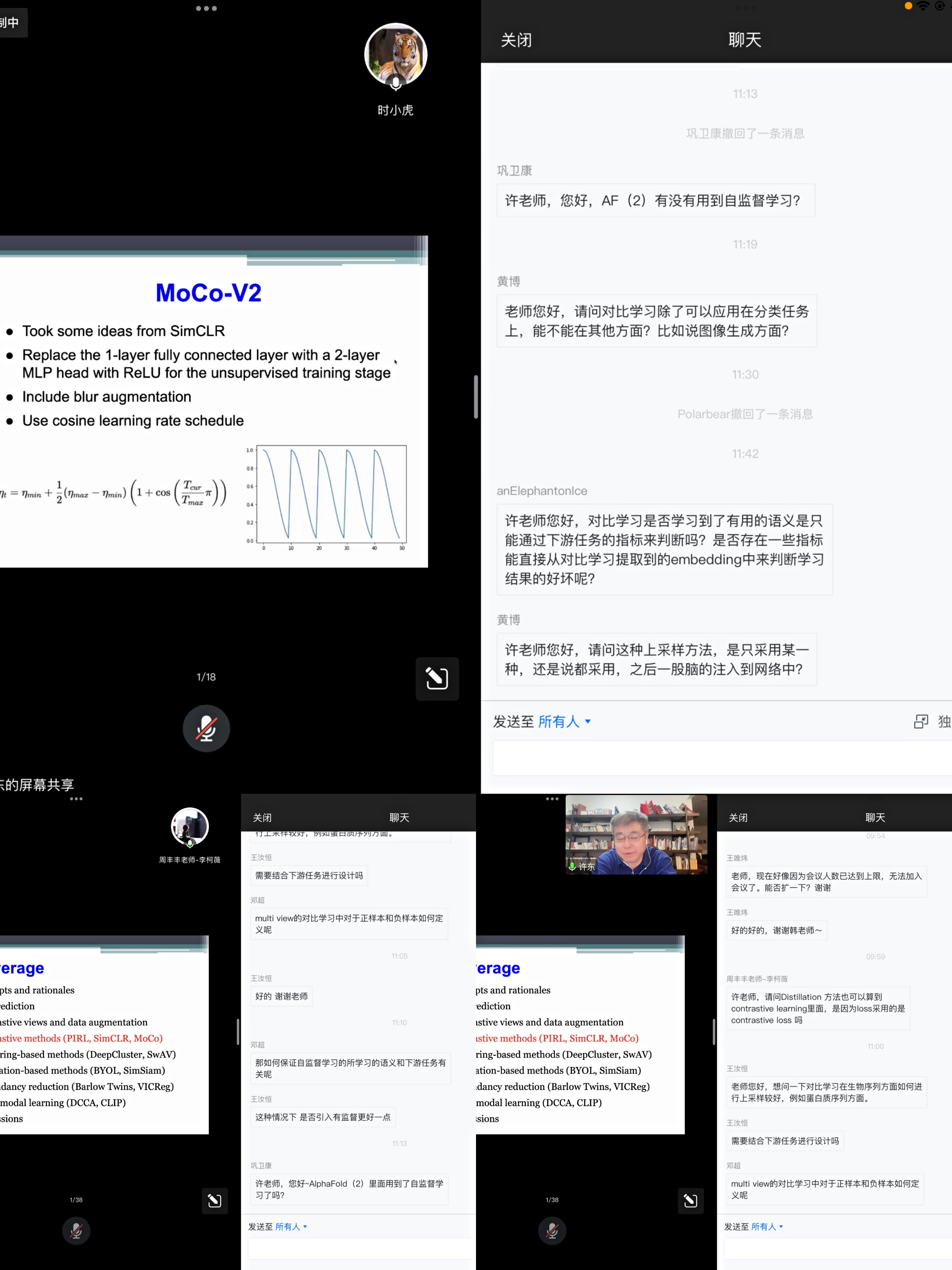 在报告的最后,许东教授给出了自监督学习与监督学习性能上直观的比较,说明了自监督学习更优的原因,从不同角度对现有的自监督学习的模型进行了分类并指出了未来自监督学习的发展方向以及目前所遇到的挑战。在讲座中及讲座后的讨论时间里,许东教授悉心回答了老师和同学们的问题。首日超过300位同学和老师参加了本次报告,并受到了我院师生的一致好评。