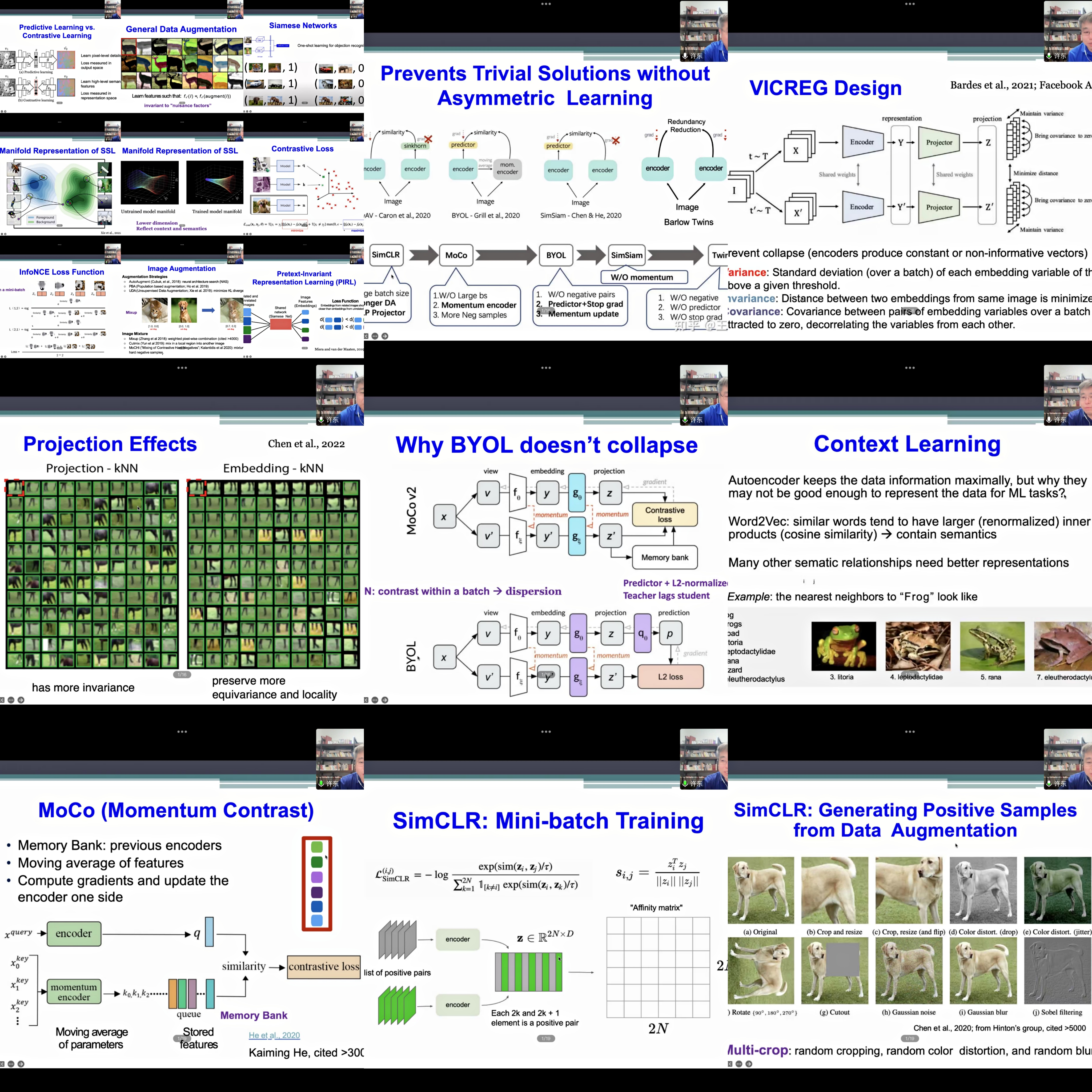 近年来,自我监督学习 (SSL) 通过利用大量未标记数据集获得有意义的语义表示,取得了令人瞩目的成功。SSL采用自定义伪标签作为监督策略,通过学习显著提高下游任务的性能。在本次报告中,许东教授由浅入深的带领大家回顾了三种主要的SSL方法,即自我预测、对比学习和减少冗余,许东老师也提供了各个方法的相关详细信息和比较,包括对比学习方法(PIRL,SimCLR,MoCo),基于聚类的方法(DeepCluster,SwAV),基于知识蒸馏的方法(BYOL,SimSiam),减少冗余方法(Barlow Twins,VICReg)和多模态学习方法(DCCA,CLIP)。