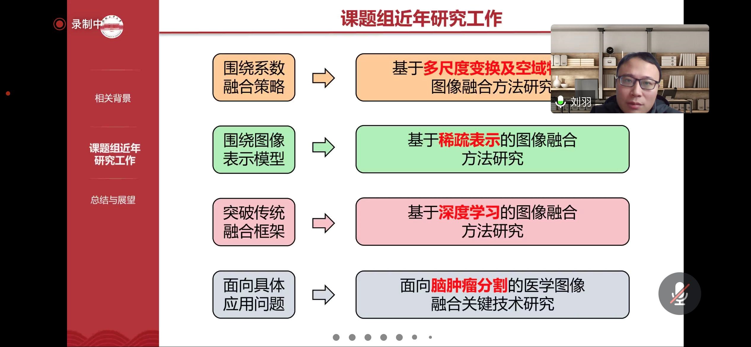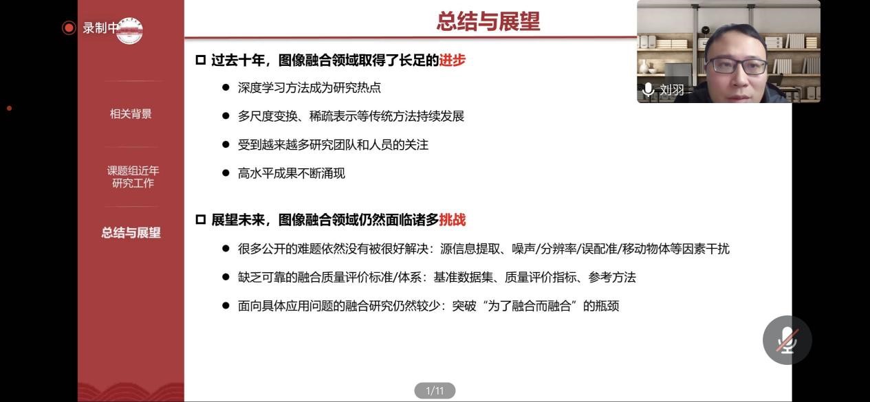 在讲座中,刘羽老师首先介绍了像素级多源图像融合的基本知识,像素级多源图像融合技术旨在综合同一场景下多幅源图像包含的重要信息,生成能够更加全面、准确描述所述场景的融合图像,从而帮助人或机器更好地理解场景和完成决策。刘羽老师通过当下图像融合领域中所面临的困难逐步介绍了多聚焦图像融合、多曝光图像融合、红外与可见光图像融合以及医学图像融合相关工作。随后,对图像融合领域进行了总结并列出未来将面临的挑战。