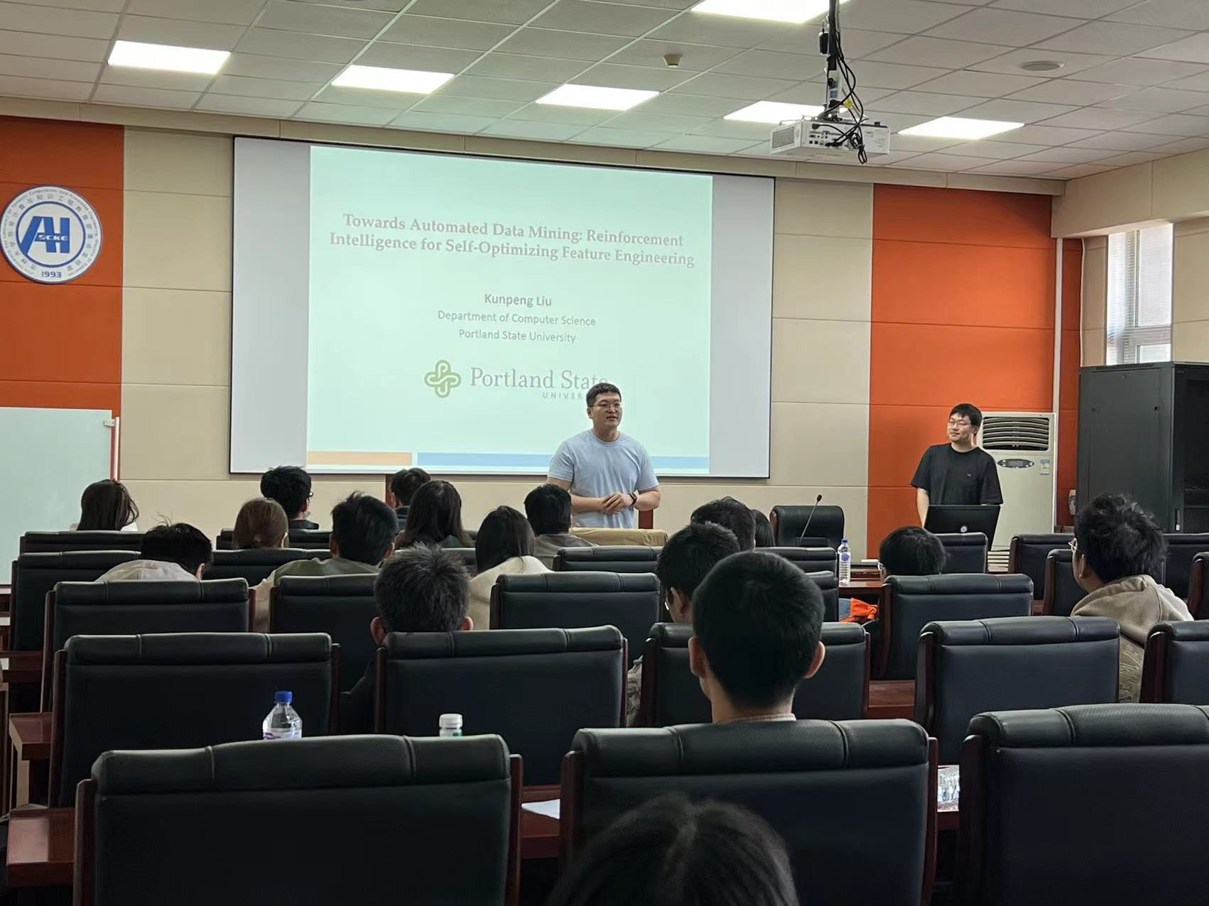 2023年4月21日,波特兰州立大学刘鲲鹏助理教授应pp电子游戏官网邀请,在pp电子游戏官网中心校区王湘浩楼A521作了题为“自动化特征工程:填补特征工程与自优化之间的空白”的学术报告。pp电子游戏官网徐原博副教授主持了讲座。