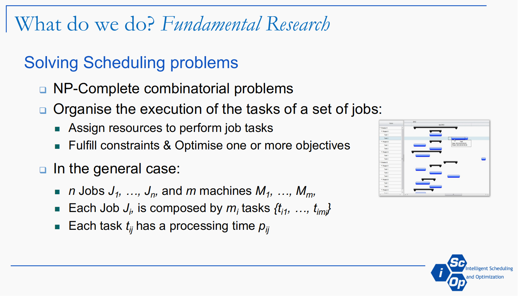 首先,报告介绍了iScOp团队的背景和成员构成,以及他们位于西班牙北部沿海的地理位置。报告强调了团队在智能调度和优化领域的专业性,包括11名研究人员和5名博士生,他们是奥维耶多大学的官方研究团队。