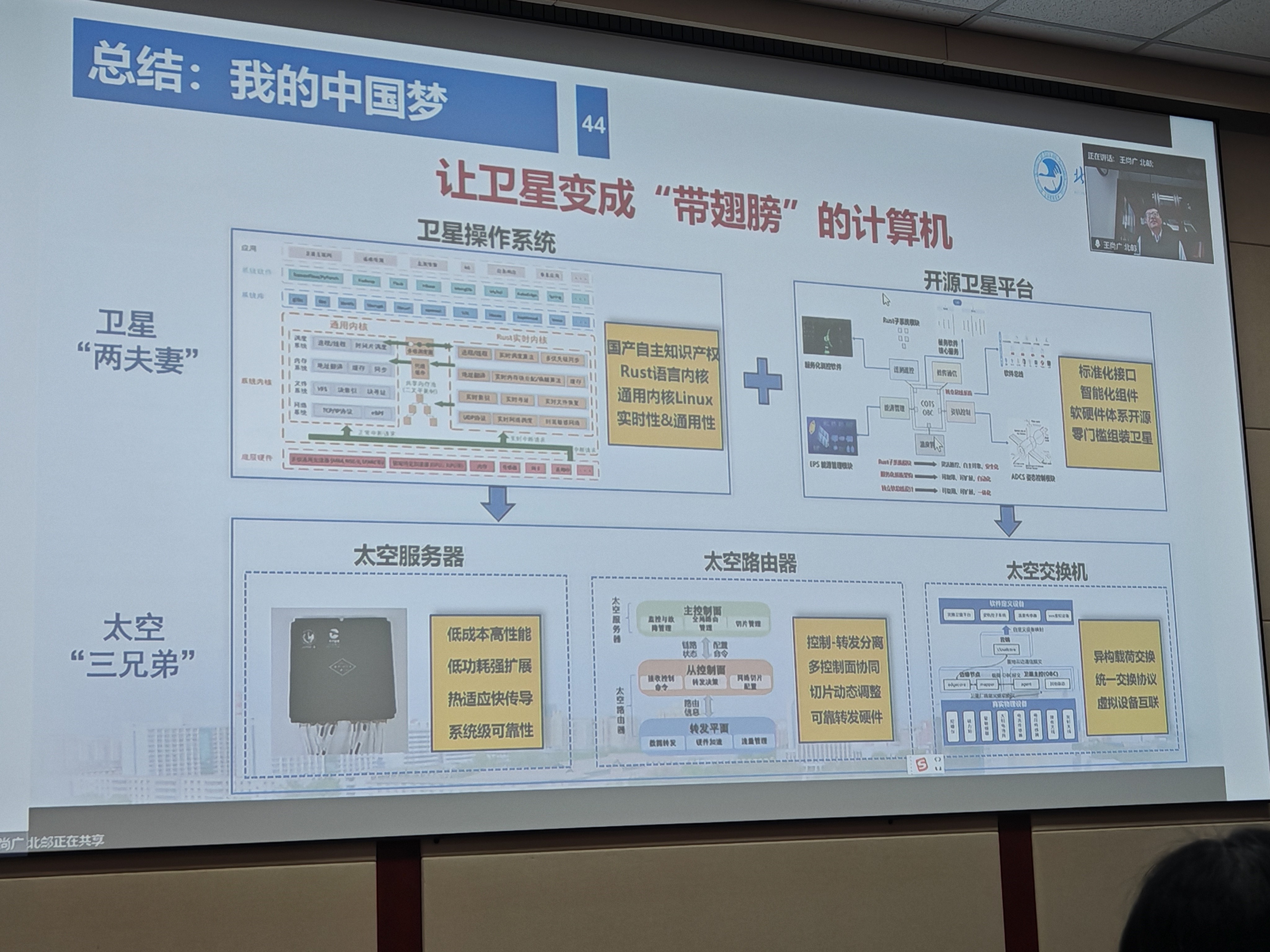随着卫星智能技术的发展,低轨卫星正逐渐成为太空中的关注热点,在讲座中,王尚广教授首先介绍了北邮天算星座的建设目标、系统特点和科学价值,然后介绍了在卫星云原生平台、卫星大模型、卫星核心网系统等天算代表性工作,最后报告了团队在“卫星俩夫妻”即卫星操作系统和开源卫星平台,以及“太空三兄弟”即太空服务器、太空路由器和太空交换机方面的进展。