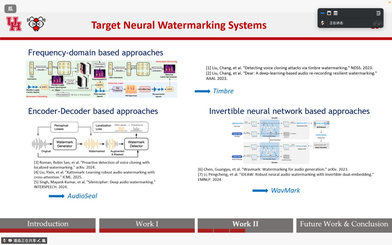在报告中,潘淼教授首先介绍了智能音频水印技术的研究背景及其在数字版权保护领域的重要性。随后,他深入剖析了当前智能音频水印机制的验证方法,重点探讨了现有技术在面对恶意攻击时存在的安全脆弱性。潘教授结合其团队的最新研究成果,详细展示了如何识别这些漏洞,并提出了增强水印鲁棒性的潜在技术路径,为相关领域的安全研究提供了新的视角和思路。