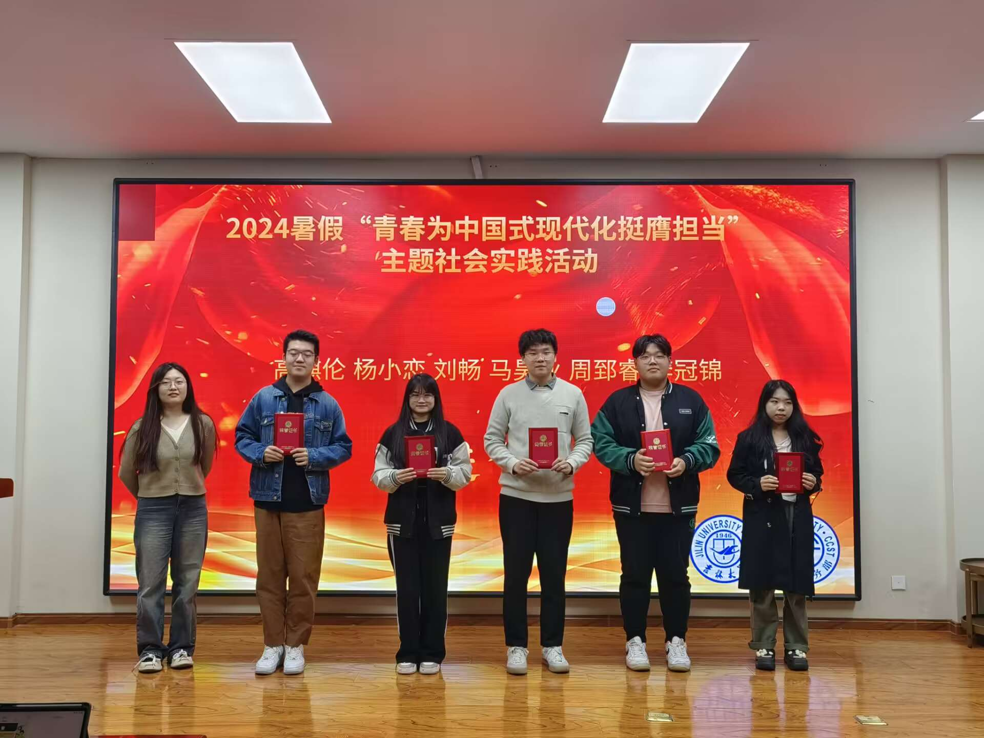 学生会志愿服务部代表给五个先进团队颁奖。
