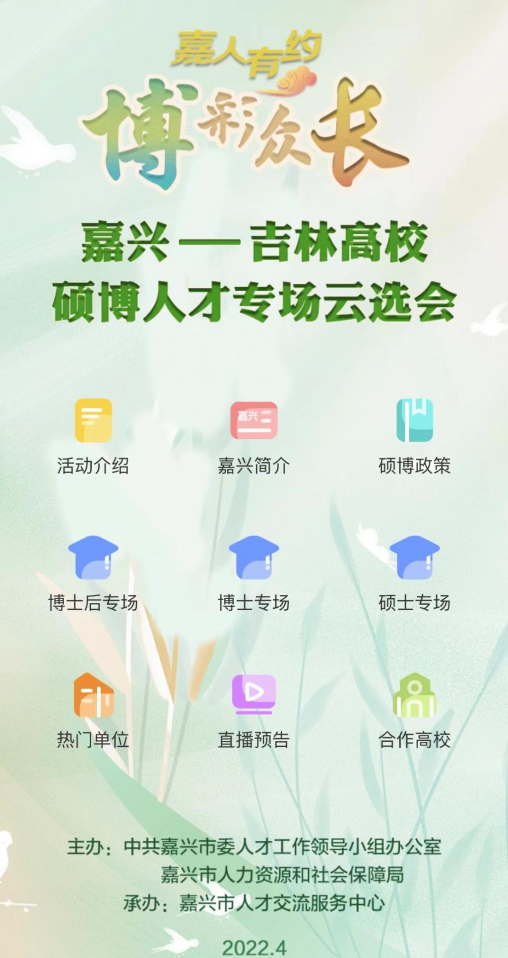 4月22日14:00,“嘉人有约·博采众长”嘉兴——吉林高校硕博人才专场云选会即将开始啦!作为今年嘉兴硕博引才的重要活动,以博士后专场、博士专场、硕士专场的形式通过云宣传、开展云对接,重点招引有意来长三角地区的高层次人才。